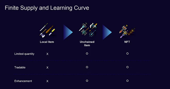 The first and the most basic step is represented on the left, the ‘local items.’ These primarily consist of beginner’s equipment item. They are not quantity controlled and can be distributed to beginners just like the conventional system. But they are not tradable nor can be enhanced. Next is the ‘Unchained item’ in the middle. It serves as a bridge between the local item and the hard-to-get advanced NFT items. Unchained items are quantity controlled but exist in larger, more generously set quantities, resulting in less severe competition. Additionally, the abilities of unchained equipment grow along with the character’s level up to a certain point. So the item’s utility duration is much longer than that of other items. Unchained items remain highly useful for several weeks of gameplay and character growth. By this time, users will need to acquire the NFTs, which involves higher competition level. Indeed, setting the maximum quantity may act as a hurdle. You might also want to consider steps like the above to gradually ease-in the users with gentle learning curve design.