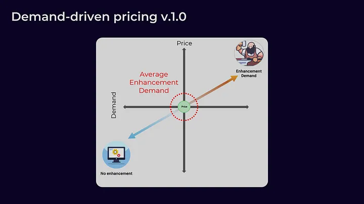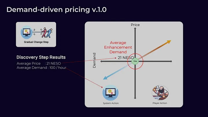 To build this system, we needed to collect some data. So, we’ve first created a step called ‘Price discovery step’. During the price discovery step, which happens over 7 days since the very first enhancement on an item, we try to collect three pieces of data. 1) Starting Price, 2) Average Enhancement Price, and 3) Average Demand, which is measured by average demand per hour. With this data, we can eventually build the demand-driven pricing model outlined in the previous slide.