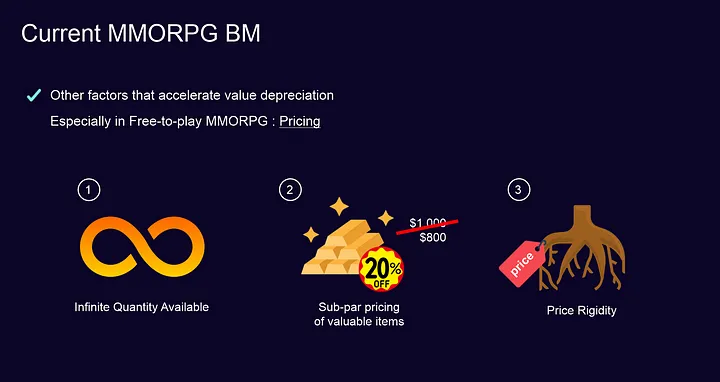In MMORPGs, the story is quite different. It might appear similar, but fundamentally, you are in competition, competing for resources and rewards against other players. Shortly after starting a multiplayer game, you begin engaging and interacting with other users, essentially ‘transacting’ in a free-market environment. There are much more complex economic interactions among players, which were not present in single-player games. The market price of what you own becomes a critical factor. To be more precise, the factors that may influence the market price of your item are very important, such as how many items are currently available, how fast does this circulating supply increases, and the rarity of this item.