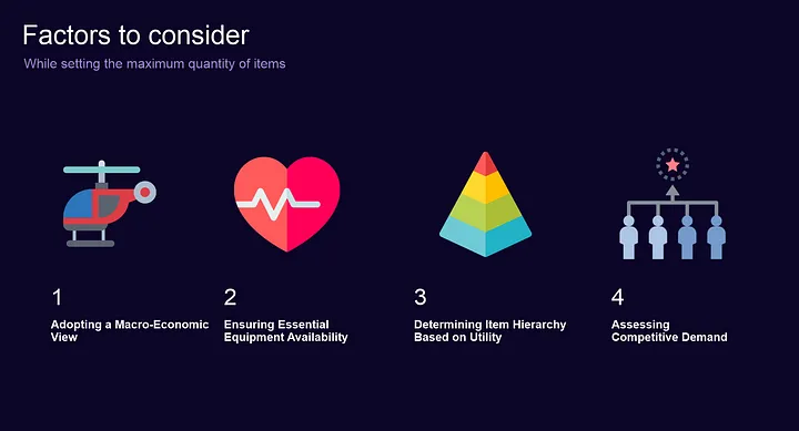 Returning to the slide we previously viewed, we must now determine the total quantity of each item. While there may not be a definitive answer, my team has undergone numerous cycles of assumptions and test iterations to finalize the numbers. Among the many factors considered, four main factors stand out. Let’s go through them one by one.