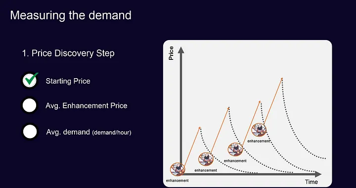 Let’s first take a look at the starting price. Where should the price start? Especially for the first ever enhancement demand? We’ve experimented different numbers, trying to find the golden number. After enough iterations, we realized that only ZERO is the right price, especially when our original intent is to let demand drive the price. From zero, if someone enhances the item, the price will jump high, and it will immediately start to drop, about 5% every minute until someone presses the enhance button. At the same time, we collect all the price points at which the enhancement was purchased, and we calculate the average. By the way this discovery step ends if 30 enhancements are done, or 7 days later, whichever comes first. Simultaneously, we also look at the purchase points and calculate the average demand per hour.