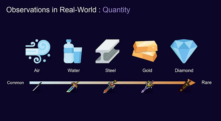 Now let’s take a look at the real world, and how resources exist. From air, which we don’t feel is rare at all, to water, and even diamonds, which we can perceive as very rare, there is a difference in the degree of rarity. But ultimately, everything is a resource that exists in limited quantity. I believed that game items should also exist in a finite number, just like in the real world, where their value is assessed based on scarcity and demand. That was about the infinite quantity of items that can lead to inflation and decrease the value of the user’s in-game assets.