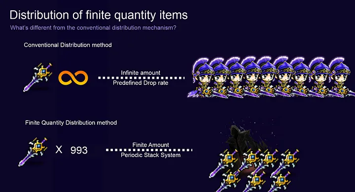 Now, let’s delve into today’s topic of supplying these essential items in finite quantity. Monitoring the quantity, issuance, and distribution of items becomes very important. Blockchain proves to be a valuable tool in making this process transparent and observable to all. Hence, all major assets in MapleStory Universe are managed by the blockchain protocol, allowing for free tradability. This is one of the reasons why we introduced blockchain technology and transformed MapleStory N into a blockchain MMORPG.