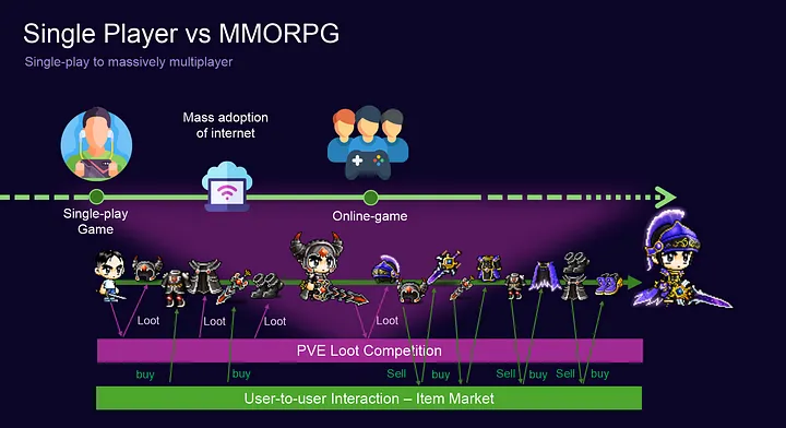 To understand the context, let’s do a quick recap on the evolution of games. Once, there was an era dominated by single-player games, which I thoroughly enjoyed as a child. Then came the widespread adoption of the internet, ushering in a new era of online multiplayer games. In a single-player game, it’s a solitary endeavor against the environment. The focus lies on hunting and looting items within a predetermined setting. A decent single player game offers around 50 to 100 hours of gameplay before confronting the final boss. In this single player game, no one really cares about the price of the item. All that matters is that you loot items, and get stronger along the way, getting prepared for the final boss battle.