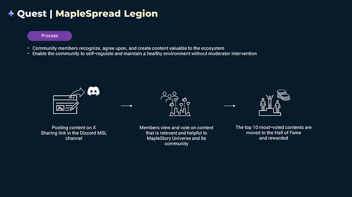 Users spreading information on MapleStory Universe or creating content related to MapleStory Universe is also contribution. The Quest system is here to nudge users in the right direction, and to measure and reward these contributions accordingly.