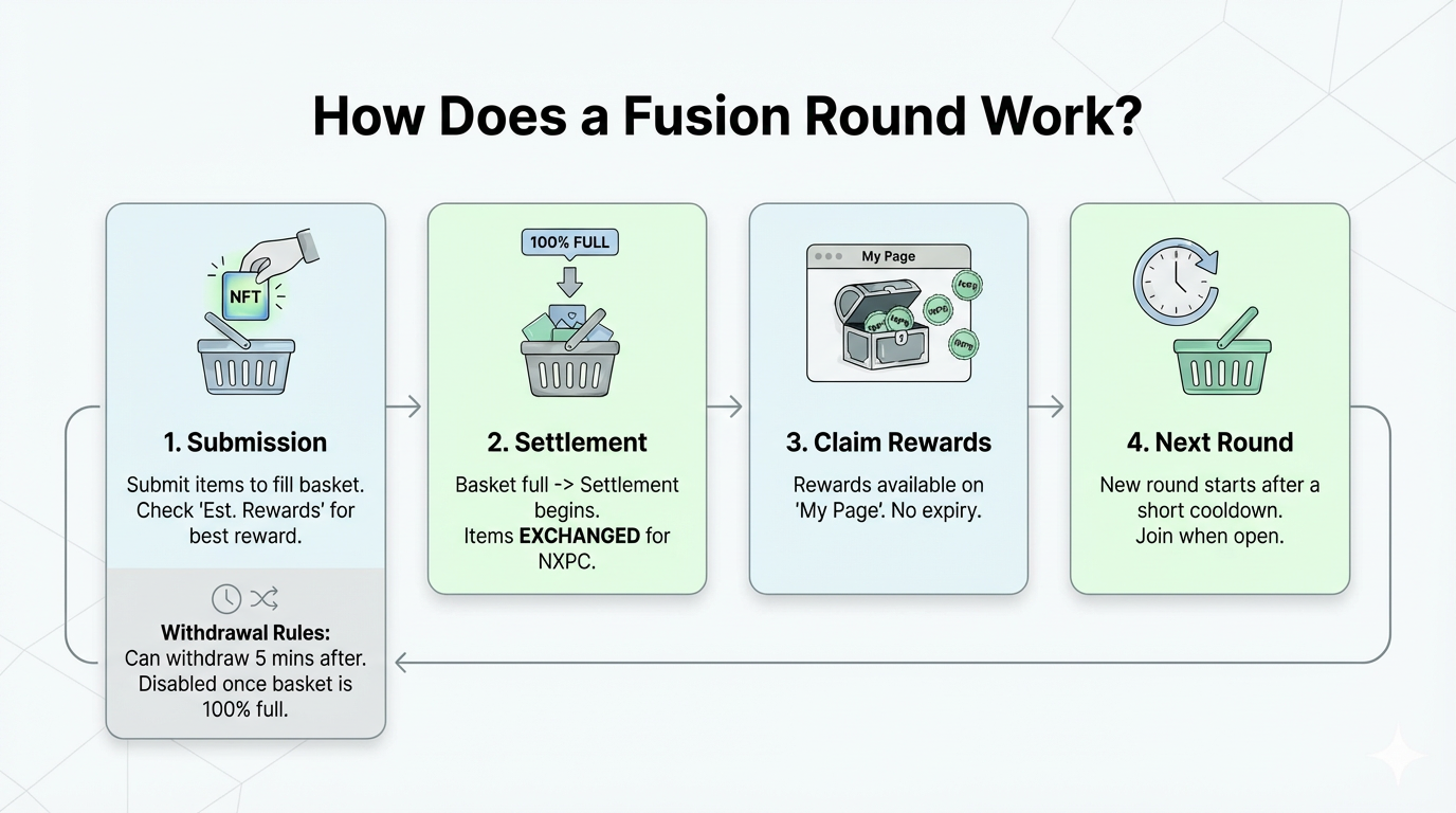 When users spend NXPC to acquire items through Fission, that NXPC is temporarily locked. Fusion releases this locked NXPC back into circulation as users return items to the Item Pool. This cycle allows Fission and Fusion to work together, maintaining a balanced item supply based on demand.