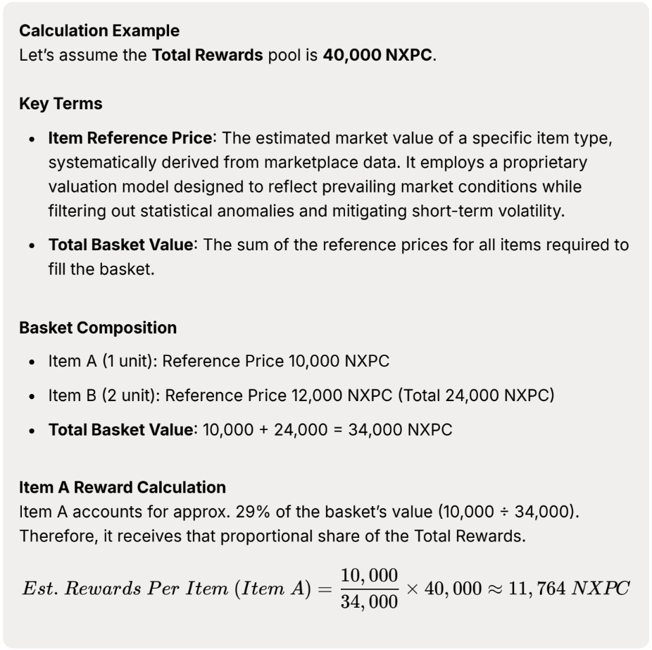 A. The ‘Est. Rewards Per Item’ indicates the projected NXPC allocation for a single unit. This figure is calculated based on the item’s relative market value within the completed basket. Put simply, the higher an item’s market value compared to the total basket, the larger its share of the total rewards.